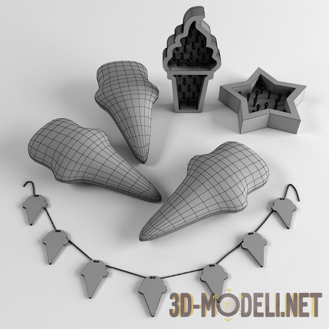 Игрушка «Мороженое», ручной работы, в трех вариантах цвета. Материалом изготовления является 100% хлопок, а в качестве наполнителя используется гипоаллергенный холлофайбер. Размер игрушки 45 х 25 см. В наборе также присутствует деревянная гирлянда, длина 1,5 м, которая послужит нежным вариантом декора для интерьера детской комнаты, особенно, оформленном в скандинавском стиле. Гирлянда состоит из семи фигурок, раскрашена исключительно вручную и покрыта безопасными красками и лаком на водной основе. Мелкие детали отсутствуют, поэтому гирлянда может использоваться детьми без ограничения по возрасту. Светильники «Пломбир» (его размер 36 х 18 х 5 см) и «Звезда» (30 х 30 х 5 см) хорошо вписываются в набор.