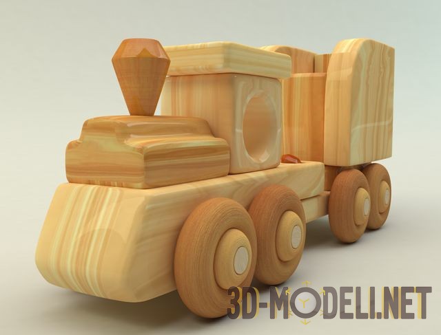 Игрушечный паровоз с вагончиком, сделанные из дерева. Детали игрушки довольно примитивны, со сглаженными углами и гранями. Колёса сделаны из бука, остальные элементы – из сосны.