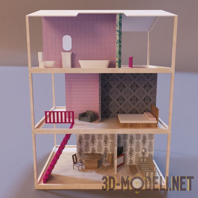 Трёхэтажный детский домик, предназначенный для кукол. Выполненый из деревянных реек каркас дома оснащён перегородками, лестницами между этажами, деревянными перекрытиями этажей, смасштабированной мебелью и обоями. Наблюдаются зоны гостиной с телевизором и диваном, спальни, столовой и санузла с полным комплектом белой сантехники.