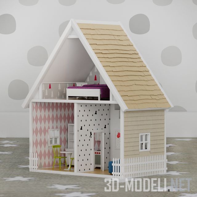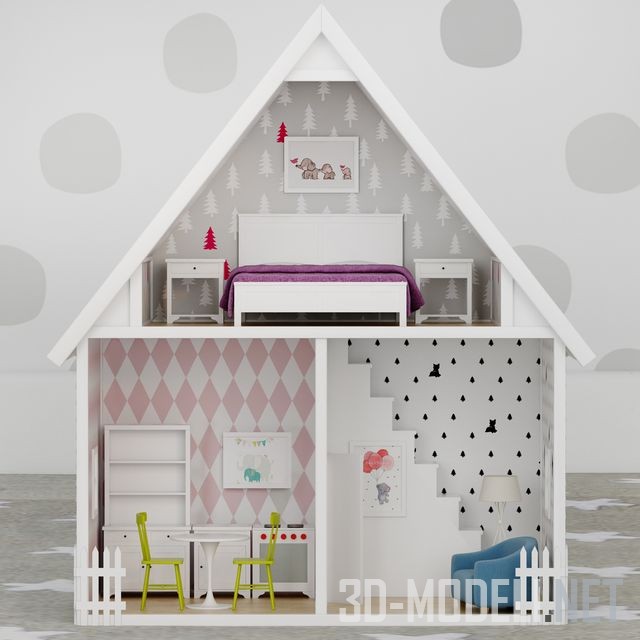 Милый игрушечный домик без передней стенки, что позволяет видеть его внутреннее наполнение: мансардный этаж, на котором расположена спальня с белой кроватью и малиновым покрывалом, а также двумя белыми тумбочками по бокам и первый этаж, разделенный перегородкой с открытой дверью. В одной части расположена крошечная кухня с белым шкафом, газовой плитой и разделочным столиком. Картину дополняет круглый белый обеденный столик и два стула светло-зеленого цвета. В другой части стоит большой торшер с белым абажуром и под ним синее глубокое мягкое кресло. Такой домик послужит прекрасным элементом интерьера при проектировании детской комнаты.