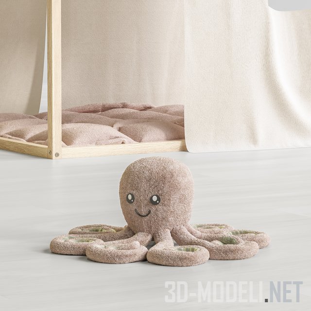 Детская палатка из светлой ткани, натянутой на деревянный каркас. Над палаткой висят пастельных тонов флажки, а рядом валяются забавные мягкие игрушки (осьминог и краб). Такую палатку можно поставить в интерьере детской комнаты.