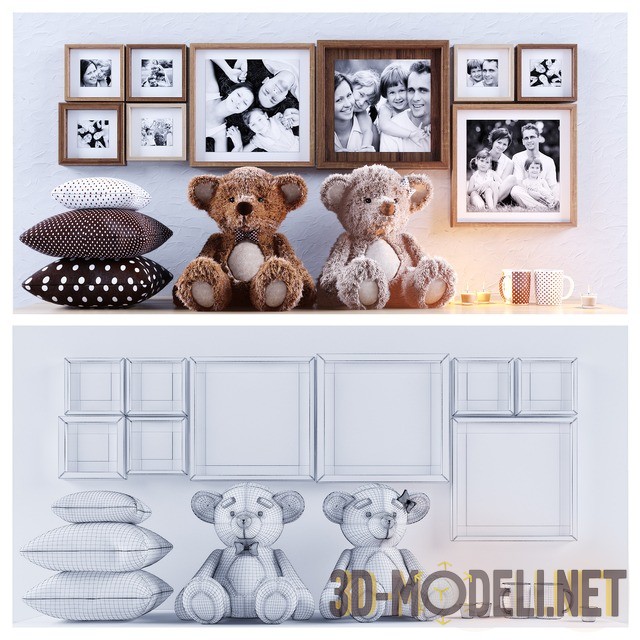 Модель игрушечных мишек имеет корректную сетку, сделана в реальных размерах, все пропорции соблюдены. В сцене присутствуют настроенные, фотореалистичные Vray материалы. В комплекте с моделью поставляются текстуры высокого разрешения.