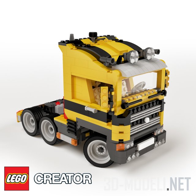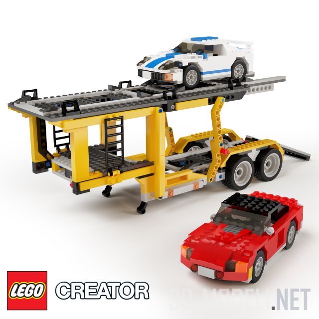 Яркая игрушка из конструктора LEGO – Creator Автовоз (6753). Сам автовоз желтого цвета. На его платформе стоят вверху и внизу две легковые машины, красная и белая.