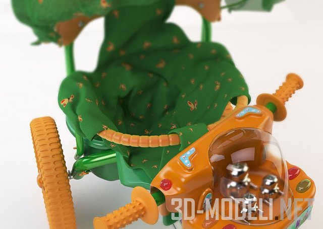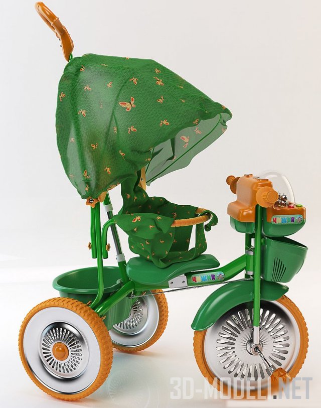 Небольшой детский велосипед на трех колесах, с раскладывающимся над головой ребенка куполом-козырьком, который защищает малыша от солнца. Козырек выполнен из зеленой ткани с изображением желто-оранжевых бабочек. Оранжевые резиновые колеса, оранжевый руль и рукоятка, за которую родители смогут управлять велосипедом в союзе с зеленой рамой, сиденьем, небольшим багажником и куполом, создают забавное изделие с «именем» «Чижик».