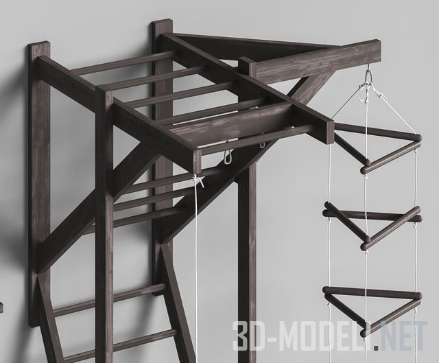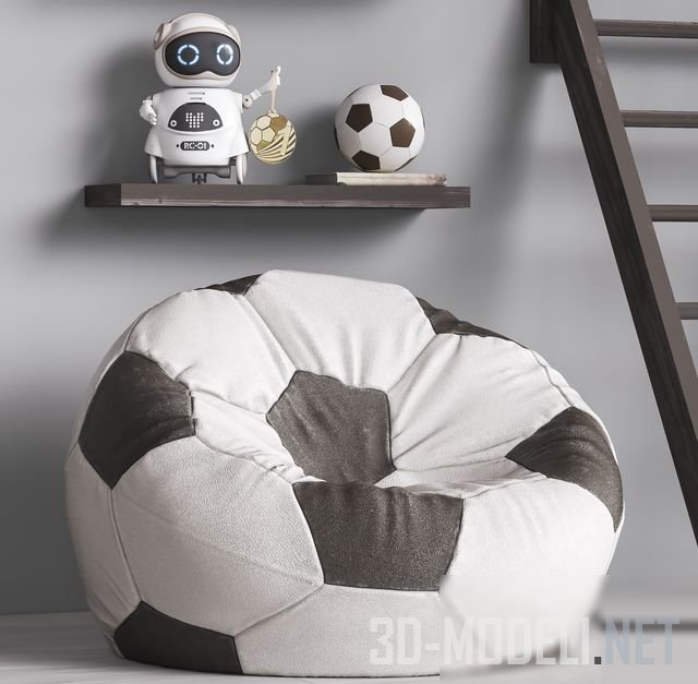 Набор для комплектации современной детской комнаты. Сет содержит мягкое кресло-пуф с тёмными вставками Puff Futbol, детский спортивный комплекс темного цвета, «К-МОДЕЛЬ» Woodbro (ширина 800 мм, высота 2400 мм, глубина 1500 мм, ширина с боковой качелей 1600 мм), а также игрушки и декоративные аксессуары. Это интерактивная игрушка робот Pocket Robot (Jiabaile), картина-постер «Бэтмен», кубки-награды, мягкая игрушка, мячи, книги и пр.