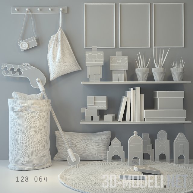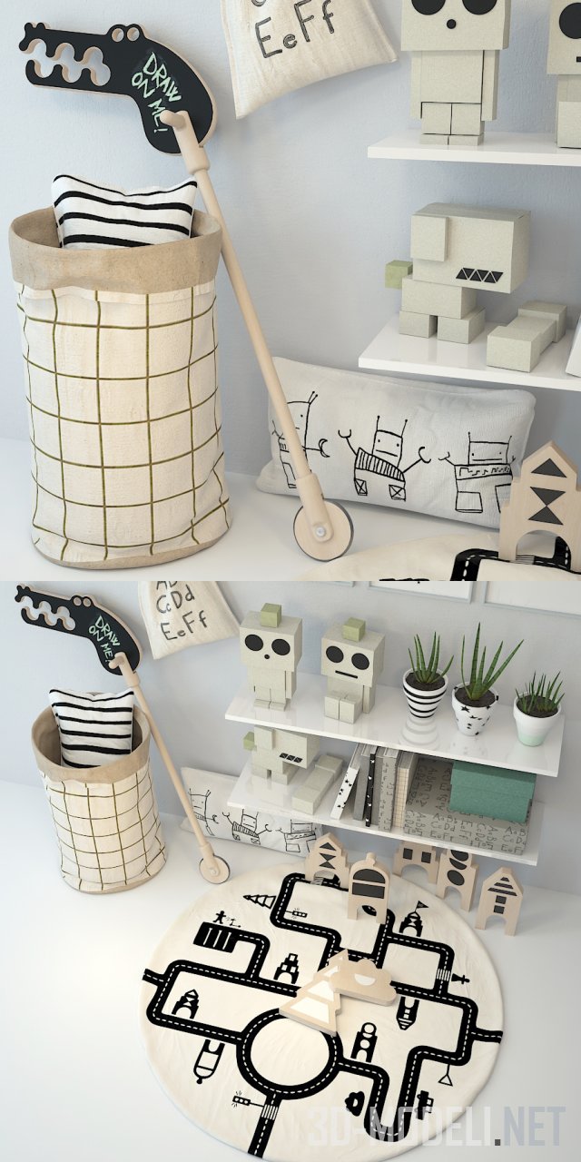 Комплект для детской комнаты от бренда «ooh-noo». В наборе животные из фанеры, коробки, книги, роботы, сумка-мешок и просто сумка на вешалке, фотоаппарат, полки с растениями, подушка, на которой можно сидеть при желании, игровой ковер, картины.