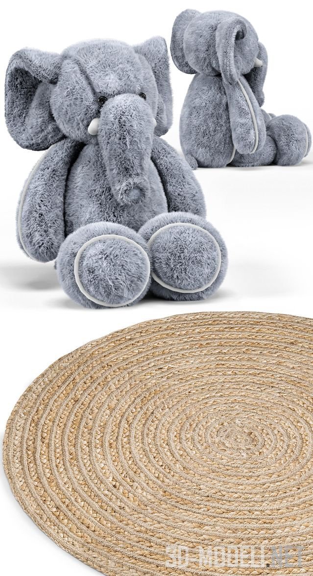 Плетеные из джута круглые, высокие корзины двух типоразмеров (45,7 х 48,2 см и 48,26 х 60,96 см). Емкости оборудованы съемными круглыми крышками и прорезями крепких ручек. Боковые плоскости корзин декорированы кружочками из более тонкого черного плетения. Светло-серый игрушечный слоненок из длинношерстного плюша уютно примостился на одной из корзин. Черный плед переброшен через край корзины. Вся композиция собрана на круглом плетеном джутовом коврике Kairo (d120 см).