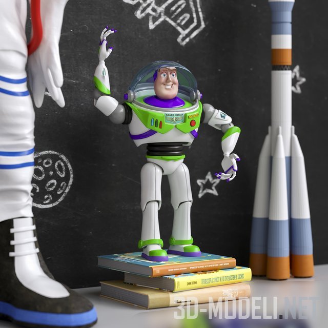 Набор игрушек и декоративных аксессуаров для детской комнаты, выполненных в космической тематике. Пластиковый игрушечный космонавт, интерактивная игрушка Баз Лайтер, бумажная ракета «Союз», грифельная доска (160 х 150 см), детский карнавальный костюм космонавта, книги про космос входят в комплект.