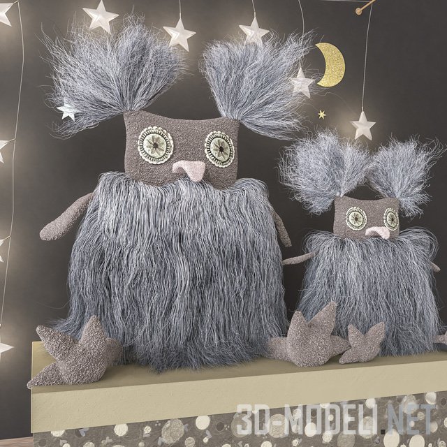 Пара интерьерных игрушек в виде мягких забавных сов WOOLY PLUSH от Restoration Hardware, декоративный деревянный скворечник, наклейки на стену в виде Луны и звезд, декоративная коробка и гирлянда со звездочками. Игрушечные совы выполнены из длинношерстного искусственного меха серого цвета и текстурированной бурой ткани.