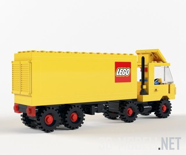 Классическая винтажная модель прицепа-тягача LEGO, впервые выпущенная в 1983 году. Тягач ярко-желтого цвета, с черными колесами и большой красной наклейкой Lego сбоку.