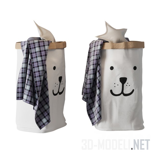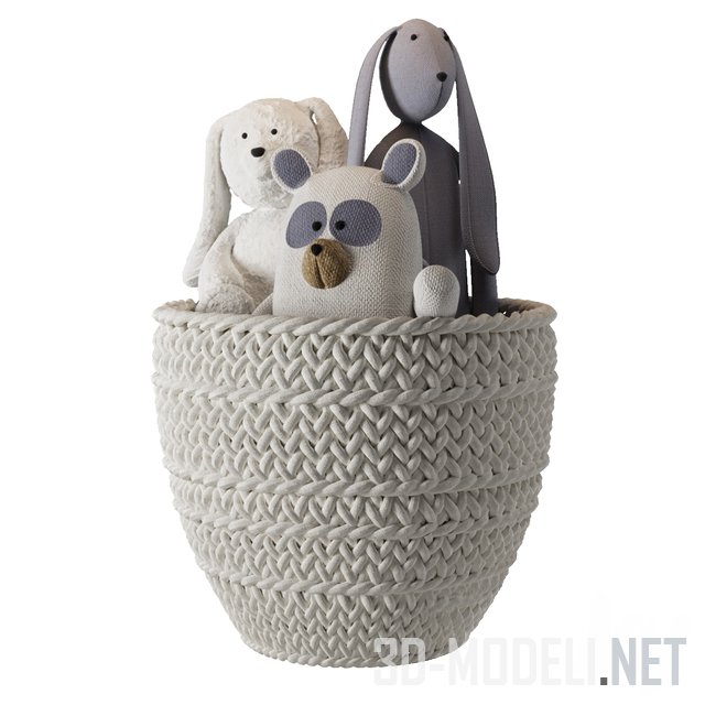 Мягкие игрушки и декор в современную детскую комнату. В наборе: плетеная корзина из водяного гиацинта с белым полотенцем, большая белая корзина из ротанга с мягкими игрушками (синим и белым зайцами, медведем), высокая цилиндрическая корзина из белой ткани с мордочкой щенка с пледом в клетку и мягкими декоративными подушками в виде звезды.