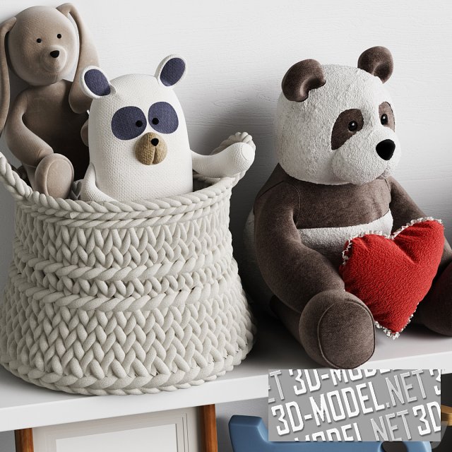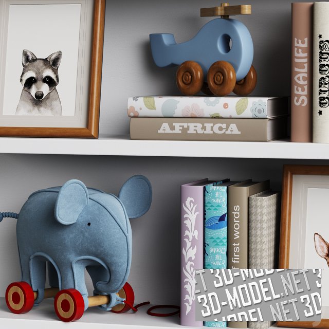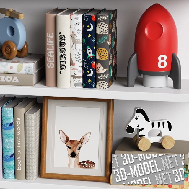 Три белые полки с аксессуарами и декором для детской комнаты. На полках: белая корзинки с мягкими игрушками (медведь и заяц), плюшевый медведь с красным сердечком в лапах, фоторамки с изображениями животных и птиц, детские книги, деревянная красная ракета, игрушечные фигурки на колесиках (вертолет, зебра и слон).