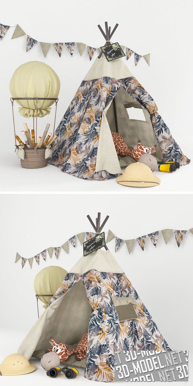 Небольшой забавный детский домик для игр - вигвам, с аксессуарами и декором. Четырехгранная тканевая пирамида смонтирована на четырех деревянных жердях. На полу вигвама - мягкий стеганый матрасик. Текстиль с пестрым растительным мотивом скомбинирован с белой тканью. Из треугольных лоскутков этих тканей изготовлена и гирлянда с флажками, размещенная над вигвамом. В хижине лежит большой мягкий игрушечный жираф. Детский бинокль и пробковый шлем на полу, корзина, стилизованная под воздушный шар с «мешками балласта» и рулонами «географических карт» зовут маленьких путешественников в незабываемые приключения.