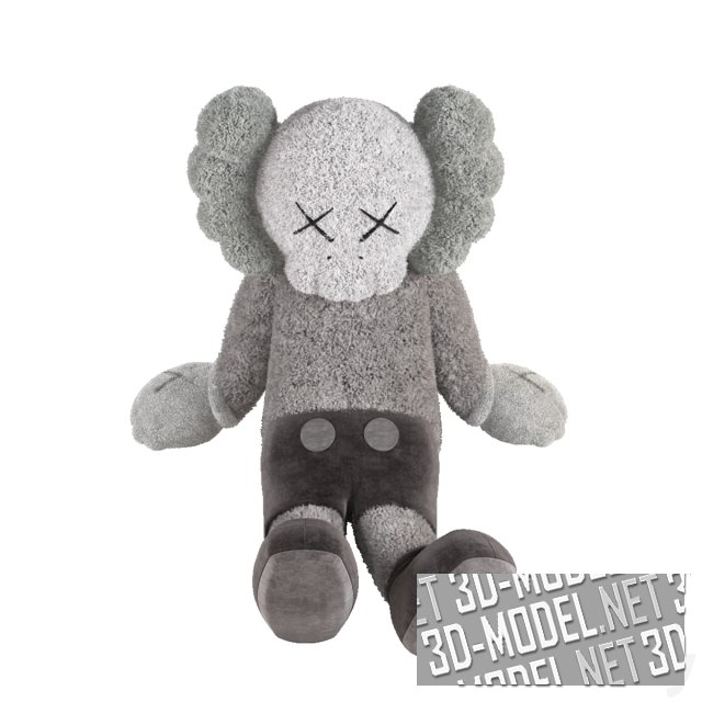 Современная кукла Kaws со стилизованным черепом клоуна и глазами-крестиками. Данная 3d-модель выполнена в виде сидящей мягкой игрушки с телом и головой из коротковорсового искусственного меха серого, белого и бледно-оливковых тонов. Шорты и тапочки из темно-серого плюша. Высота фигуры - 30см.