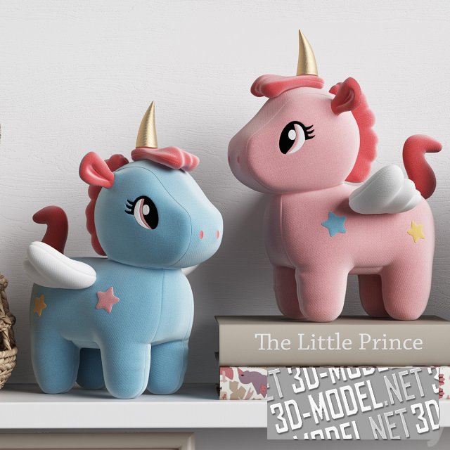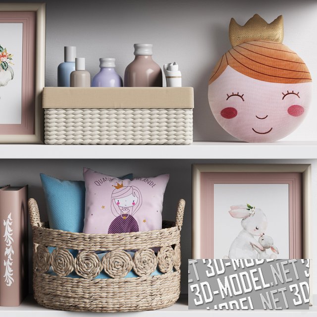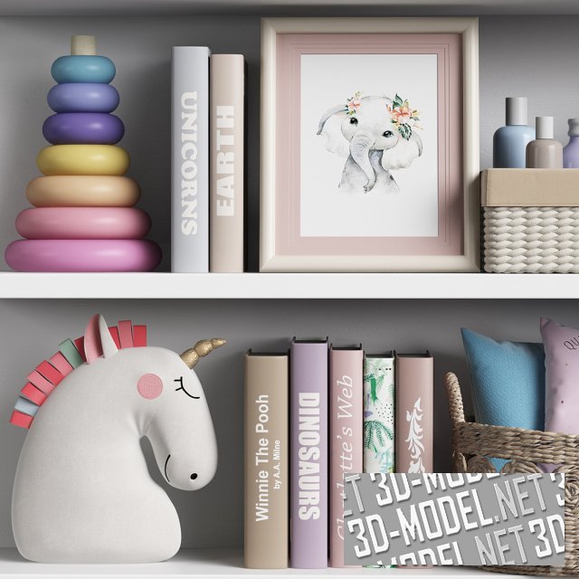 Три белые полки с аксессуарами, игрушками и декором для детской комнаты. Среди нескольких книг на полках размещены: розовый и голубой игрушечные единороги; мягкая подушечка в виде еще одного единорога; плетеная корзина с большими прозрачными ячейками; в корзине - маленькие цветные подушки с мягким игрушечным облачком; прямоугольная корзинка с бежевым вкладышем, с керамическими флаконами пастельных тонов; круглая плетеная корзинка с еще парой цветных подушечек; игрушечная пирамидка, подушечка в виде лица принцессы в короне и три фоторамки с милыми илюстрациями.