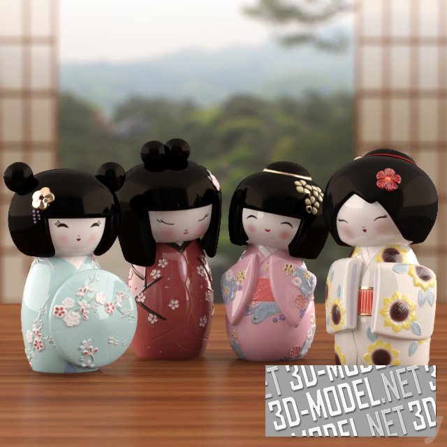 Четыре варианта японских традиционных фарфоровых куколок Kokesh от испанской фабрики Lladro (скульптор: Jose Javier Malavia). Модели в розовом кимоно с цветами, бледно-бирюзовая с цветущей сакурой, в белом кимоно с подсолнухами и красном с цветами сакуры. Высота фигурок: 14-15см.