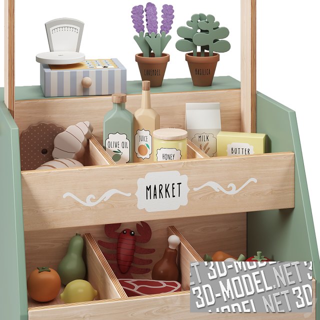 Фанерный игрушечный набор Jabadabado в виде передвижного рыночного лотка под полосатым навесом и продуктовой тележки. Игрушки заполнены миниатюрными деревянными «продуктами» и аксессуарами. Приятная цветовая гамма в стиле «Прованс» включает белый, мятный, лавандовый цвета и текстуры светлого дерева под лаком.