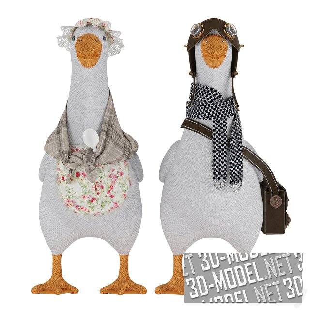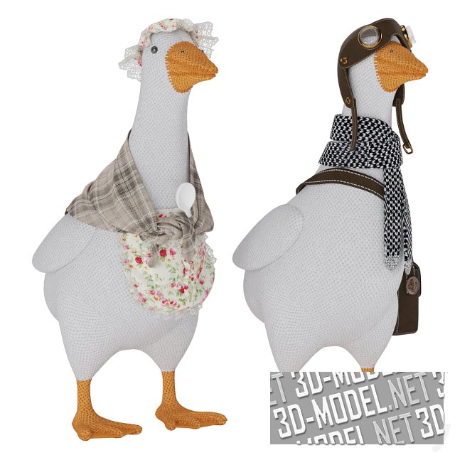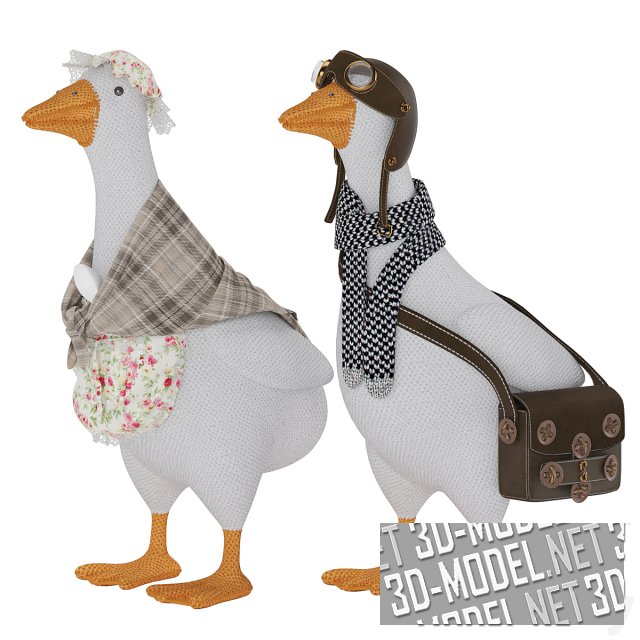 Интересная «семейная» пара вязаных гусей. Гусыня надела чепчик, фартук и накинула клетчатый платок. А гусак повязал черно-белый шарф, надел шапку летчика и взял кожаную сумку. Высота одной игрушки 20 см.