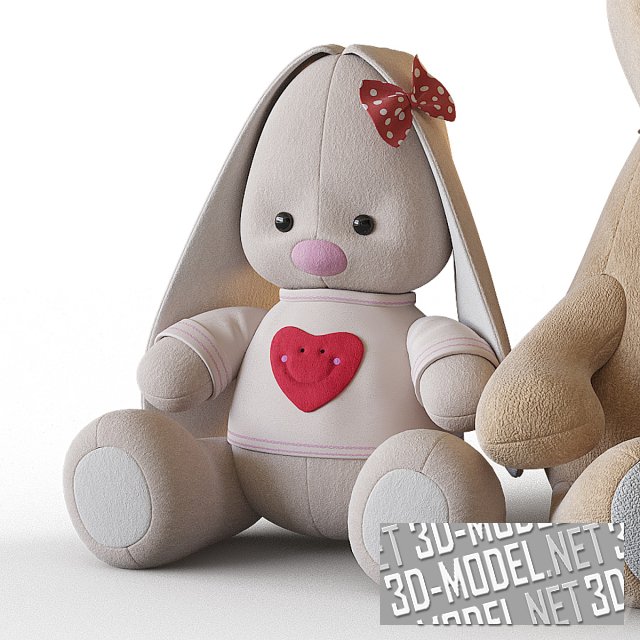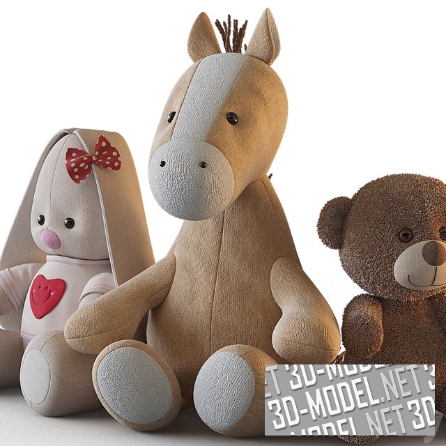 Забавные сидящие плюшевые игрушки для интерьера детской комнаты. Очаровательный зайчик светлого цвета с красной аппликацией-сердечком и бантиком в горошек, бежево-белая лошадка и плюшевый медвежонок коричневого цвета образуют милый и привлекательный набор.