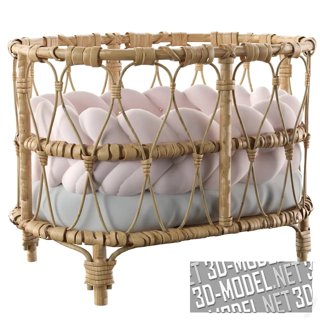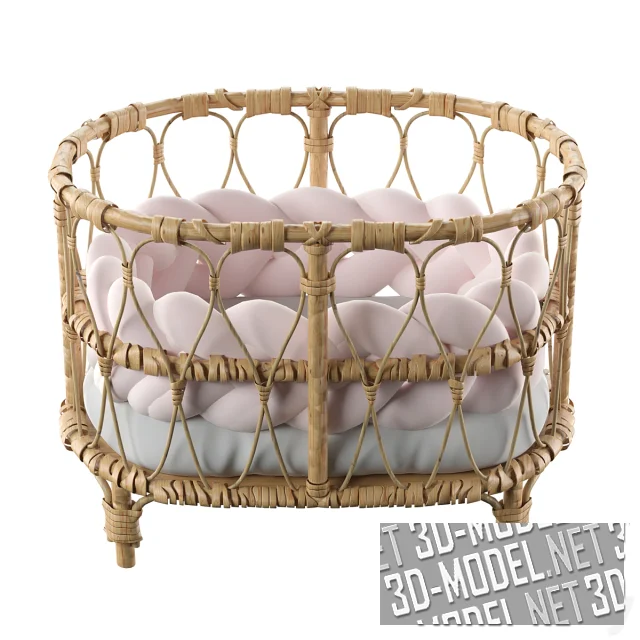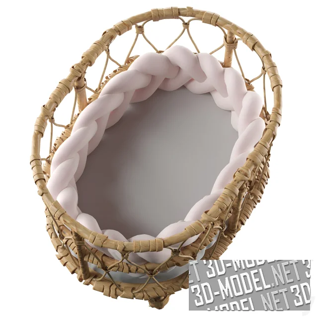 Кукольная овальная кроватка с каркасом и бортами, сплетенными из ротанга. Внутри кроватка оборудована невысоким мягким бортом из бледно-розовых мягких элементов, сплетенных в косичку. Дно кроватки светло-серое. Габарит кровати: 40х53х40см.