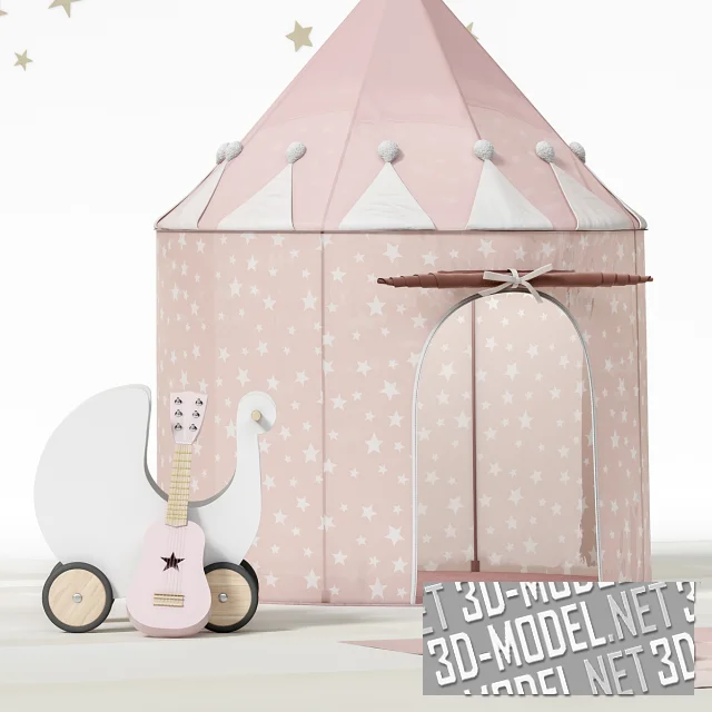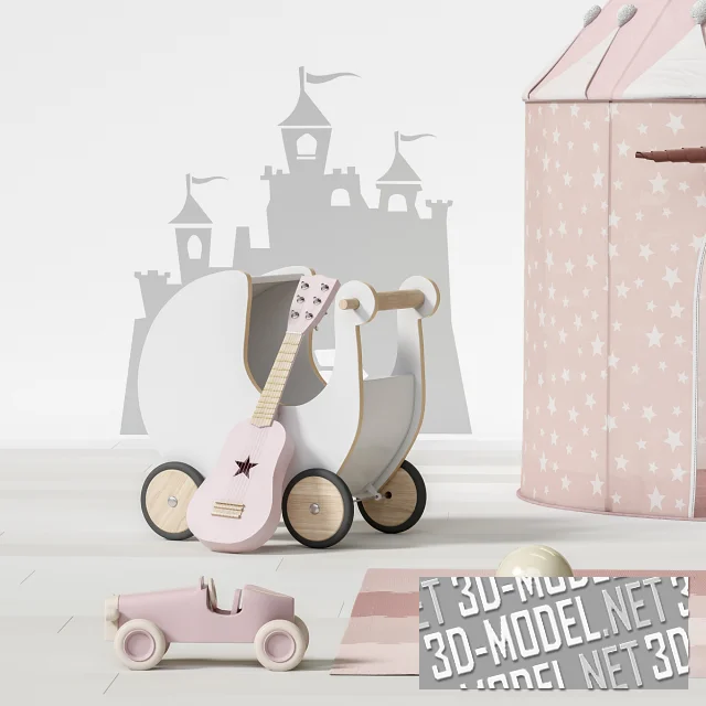 Набор для оборудования игровой зоны в детской комнате от THE MODERN NURSERY. В наборе: игровой шатер PINK STARS с цилиндрическим основанием и конусообразным куполом из легкого бледно-розового текстиля и арочным входом, коврик TMN PUZZLE PLAYMAT в розово-бежевых тонах, деревянная игрушечная коляска SEBRA BABY WALKER, настенные часы Ice Cream Wall Clock, шары пастельных тонов, розовые деревянные гитары, модель деревянной машины. На стене - виниловые наклейки: "Stars and the moon" (охристые звездочки, Луна и облако) и "Castle"(серый замок).