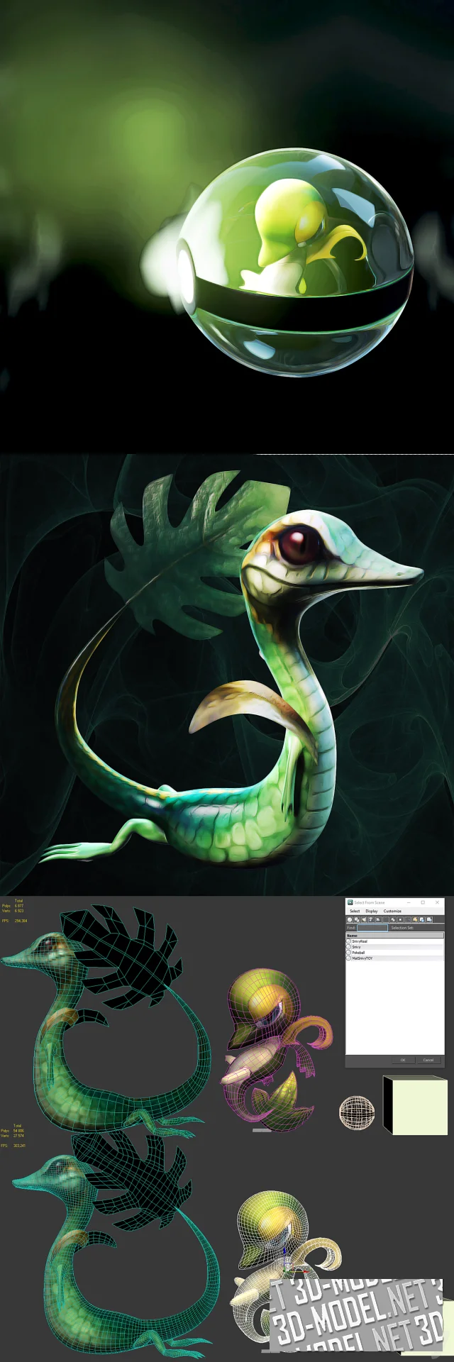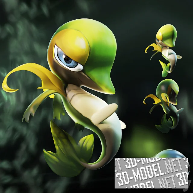 Персонаж серии игр (один из стартовых), манги и аниме "Pokemon" – Snivy (Снайви). Желто-зеленый покемон-рептилия представлен в двух ипостасях: маленький в прозрачной сфере и «взрослый».