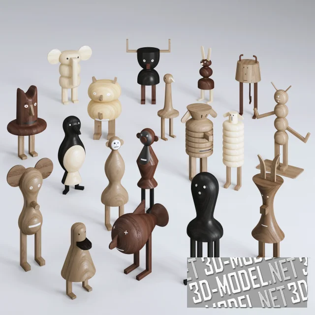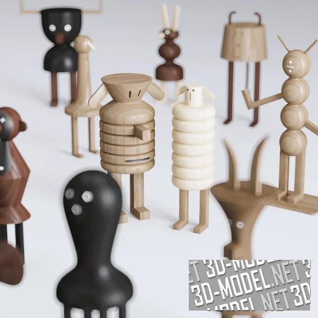 Забавные деревянные фигурки из коллекции Funny Farm от LZF (дизайнер: Isidro Ferrer). Коллекция включает восемнадцать различных персонажей, смешных существ на деревянных лапках. Фигурки выполнены из дерева разных сортов, отделаны морилкой и лаком. Некоторые фигурки скомбинированы из дерева нескольких цветов. Декор расставлен на полках и дополнен книгами, картинами в рамках, присутствует золотистый горшок с зеленым растением, шаровидный белый светильник, белые подставки для книг.
