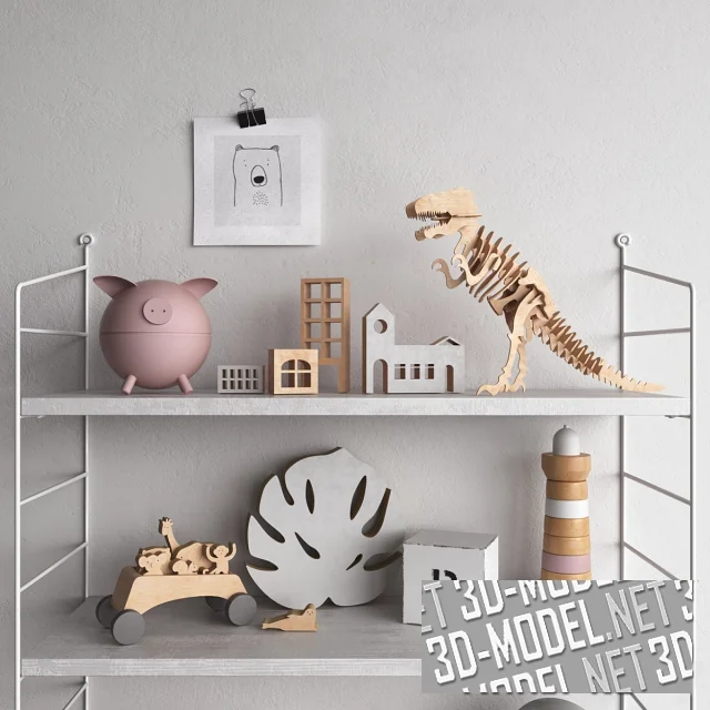 Тройная современная полка белого цвета, из древесных плит, закрепленных на белых боковинах из металлического тонкого прутка, с игрушками для интерьера детской комнаты. На полке размещены деревянные кубики, деревянная пирамидка в виде маяка, фанерные фигурки динозавров, светильник в виде серого облака, шкатулка в виде розового поросенка.