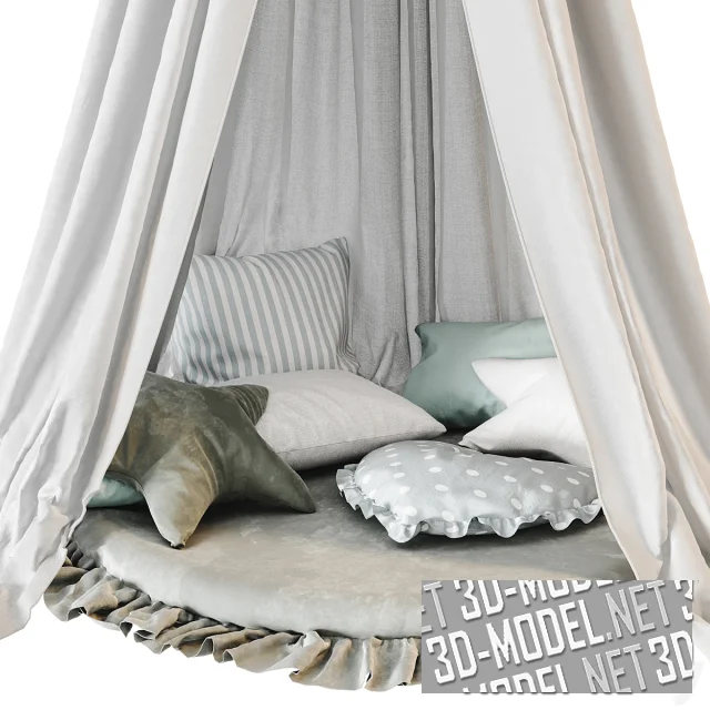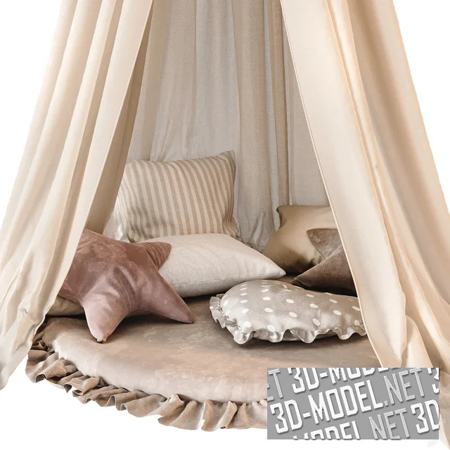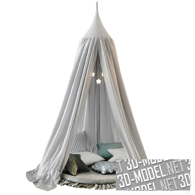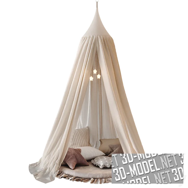 Набор для игровой зоны в детскую комнату в романтическом стиле. В сете подвесной балдахин из легкой ткани; круглый матрас с рюшами; декоративные подушки нескольких форм из разных тканей; гирлянда из нескольких подвесных звездочек. Представлены комплекты двух тонов: светло-серого (с подушками в серых, белых и бледно-шалфейных тонах) или светло-бежевого цветов (с наполнением в бежевых, бледно-коричневых и жемчужно-серо-бежевых тонах). Кромка балдахина свободно лежит на полу. Высота шатра: 220см.