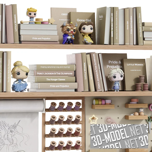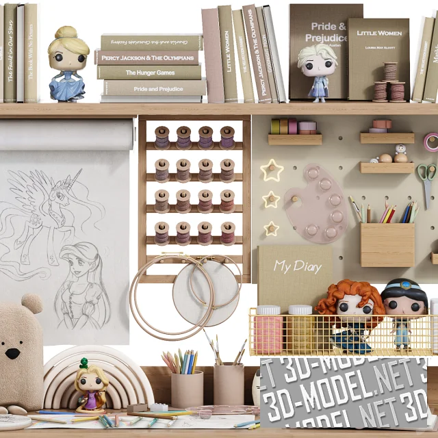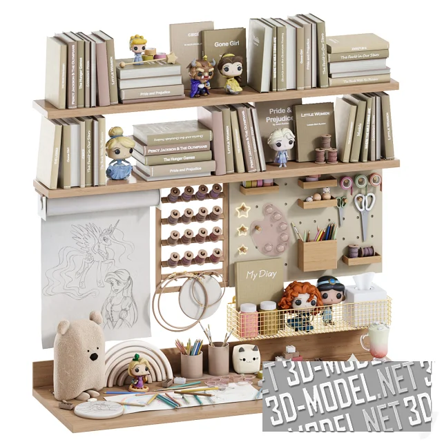 Комплект для юных любителей мультфильмов Disney. На деревянных полках размещены книги, палитра с красками, различная канцелярия и игрушки. На столе – коктейль, котик, мишка, конструктор и небольшой творческий беспорядок из цветных карандашей. В набор входят такие известные персонажи: «Аладдин» Жасмин, «Холодное сердце» Эльза, Золушка, Рапунцель, «Храброе сердце» Мерида, «Красавица и чудовище» Белль и Чудовище. Эта сказочная композиция успешно дополнит интерьер.