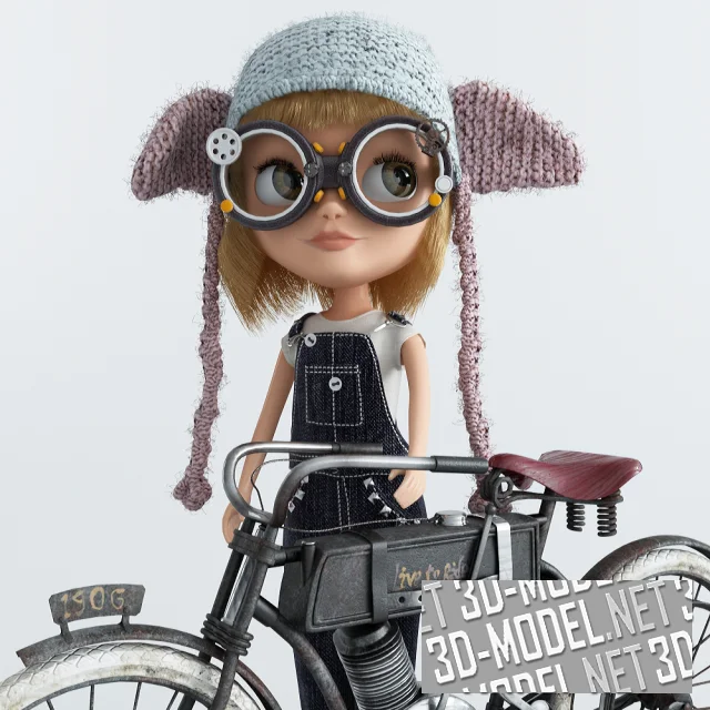 Это высокореалистичная и художественно выполненная 3D-модель, передающая тонкие текстуры трикотажной и джинсовой ткани, а также состаренного металла и резиновых деталей велосипеда. Она идеально подходит для творческих проектов, от стилизованной анимации до визуализаций на историческую тематику или демонстрации коллекционных фигурок, добавляя индивидуальности и изысканных деталей любой цифровой среде.