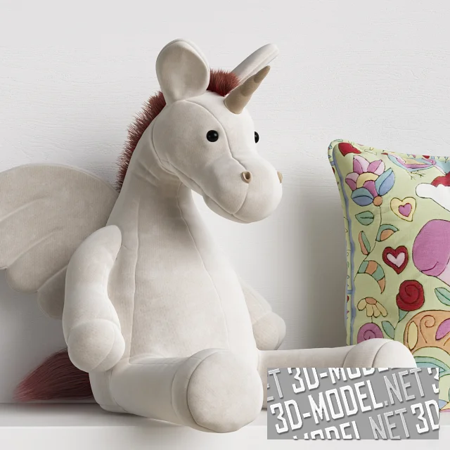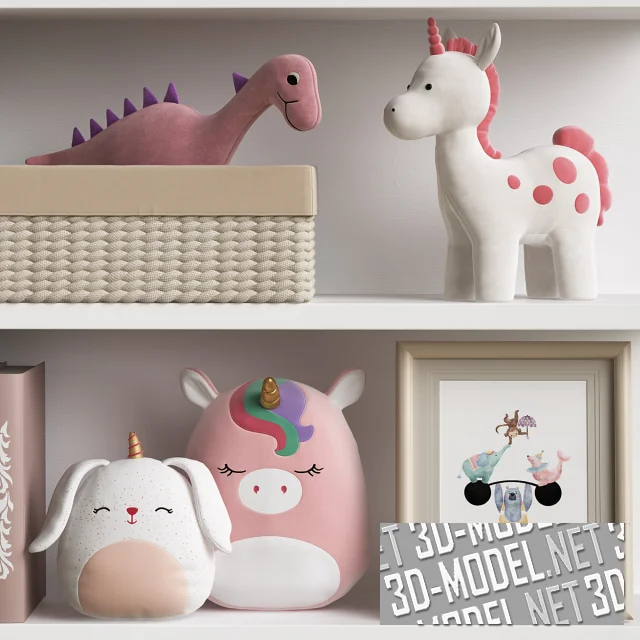 Привлекательный набор для наполнения полок. Состоит из книг, картинок в рамах, мягких игрушек и подушки с изображением единорога. Эта милая гармоничная композиция гармонично впишется в интерьер детской комнаты.