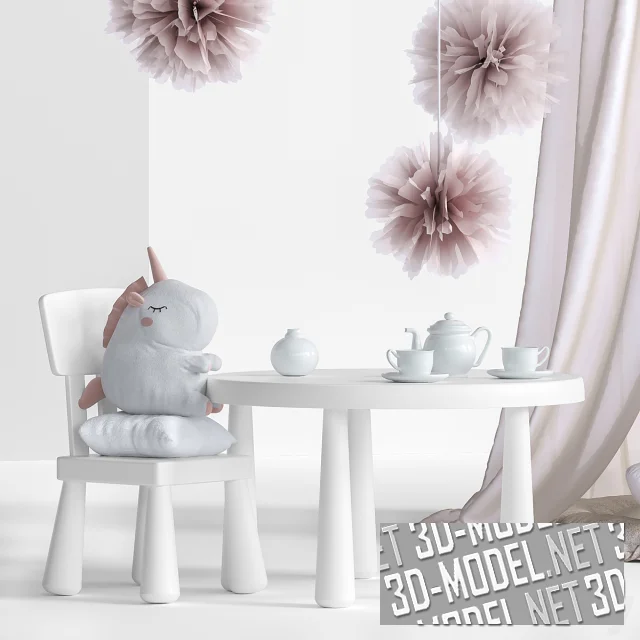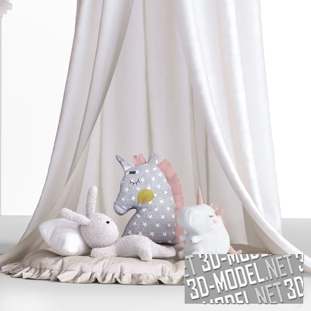Набор для оформления детской комнаты сочетает в себе мебель, мягкие игрушки и декоративные элементы, создавая атмосферу уюта и сказочности. В центре композиции находится текстильный шатер-балдахин с мягким матрасом и подушками внутри. Его дополняют милые игрушки единороги и зайчик, которые делают пространство теплым и дружелюбным для ребенка.