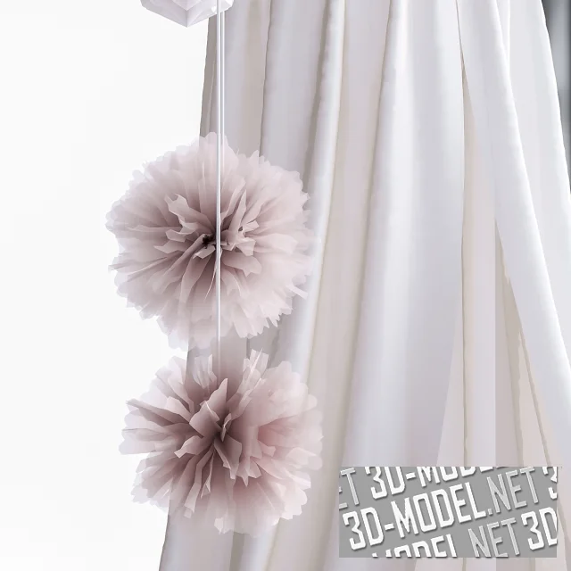 Декоративные панели на стене и подвесные гирлянды в виде нежных цветов добавляют объем и создают ощущение праздника. Для игр и занятий предусмотрен небольшой столик с детским стулом, на котором расположены сервировочные аксессуары для чаепития из IKEA.