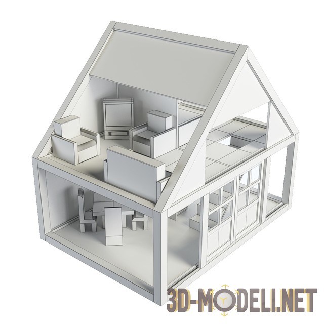 3D модель деревянного двухэтажного игрушечного домика, ручной работы, изготовленного из дерева и металла. Домик с диванчиками, кроватью, шкафом и другой игрушечной мебелью на двух этажах. Размеры домика: 400 x 550 x 500. Текстуры в архиве.