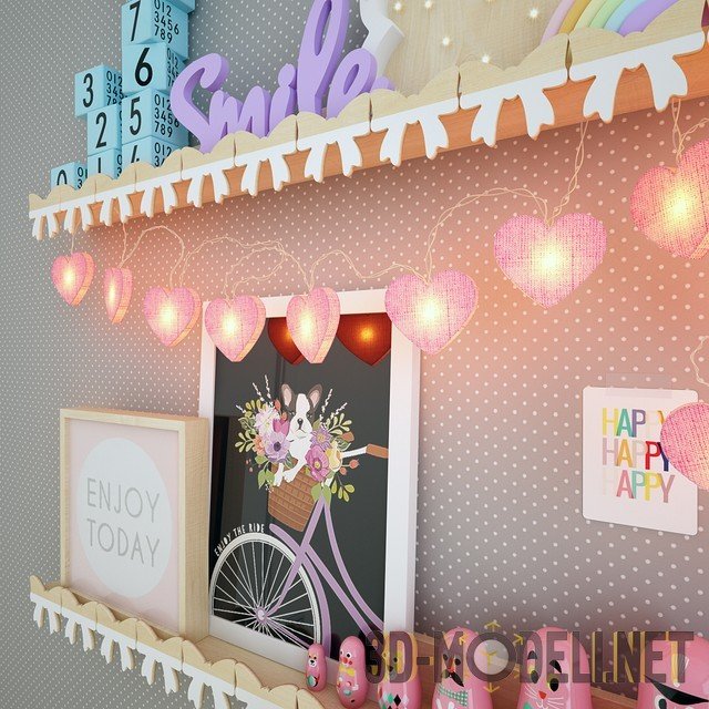 Набор декора и аксессуаров для украшения комнаты девочки, в который входит полка с бантами и расположенные на ней детали интерьера: матрёшки, постер, ночник, различные игрушки, кубики, радуга, и гирлянда. Любая комната заиграет новыми красками с этим набором.