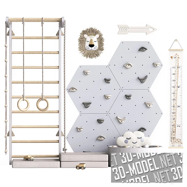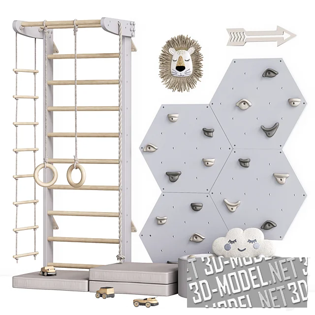Хорошо оборудованный спортивный уголок для интерьера детской комнаты. В него входят: шведская стенка с гимнастическими кольцами, канатом, веревочной лестницей, стенка для скалолазания, состоящая из четырех шестигранных панелей с пластиковыми зацепами, квадратные маты, "сухой" бассейн с шариками. Дополняют инсталляцию несколько игрушек (деревянные машинки), мягкая подушка в виде спящего облачка, настенная линейка с жирафом (для измерения роста ребенка), настенная стрелка, настенная игрушечная маска льва. Элементы подобраны в приятном сочетании белого, светло-серого, бежевого цветов.
