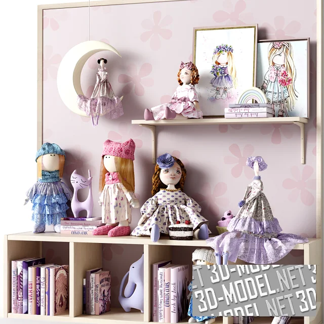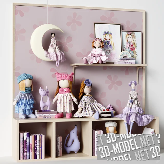 Аккуратная открытая полка с коллекцией декоративных элементов для детской комнаты. В центре внимания куклы в разноцветных платьях, мягкие игрушки и небольшие аксессуары вроде подвесной луны, миниатюрных книжек и фигурок. Нежная пастельная палитра, сочетание древесной фактуры и розово-лилового фона с цветочным узором создают атмосферу детской комнаты или уютного творческого уголка. Такой набор уместен как декоративный акцент на стеллаже, в зоне игры, в фотозоне или витрине магазина, где требуется мягкое и дружелюбное визуальное настроение.