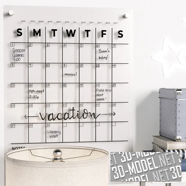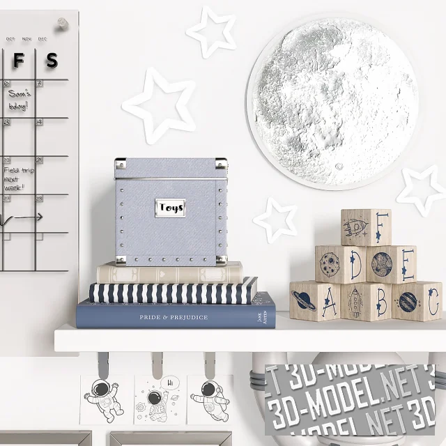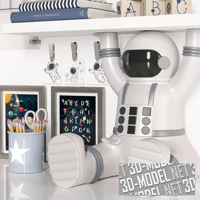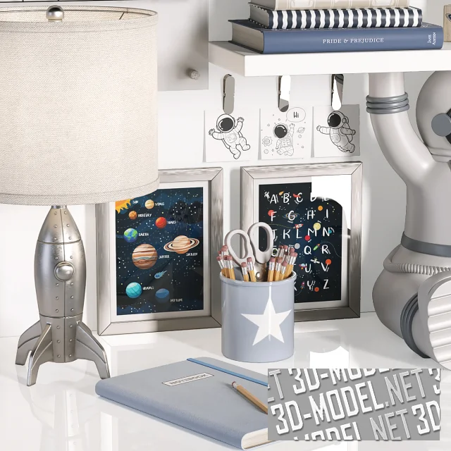 Комплект для наполнения детской подростковой комнаты. Одним из знаковых аксессуаров является светильник Rocketship от Pottery Barn Kids. Основание настольной лампы в форме ракеты изготовлено из алюминия, покрытого оловом. Интересную мебельную конструкцию представляет фигурка космонавта, которая удерживает полку. На полке книги, шкатулка и деревянные кубы. Дополняют композицию календарь, картины, органайзер с простыми карандашами и ножницами, блокнот с ручкой и настенное панно в виде Луны.