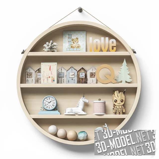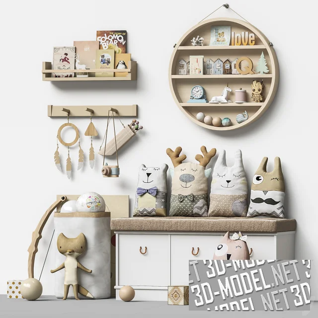 Полки и пространство наполнены игрушками (кубики, единорог, стакан для карандашей Грут; домики, кит, елка, деревянные «ловцы снов», лук и колчан со «стрелами», деревянный фотоаппарат, кубики, мячи), книгами, сувенирами. Дизайнеры избегали ярких цветов и подобрали все элементы в светлых, пастельных тонах с преобладанием белого и светлой древесины.