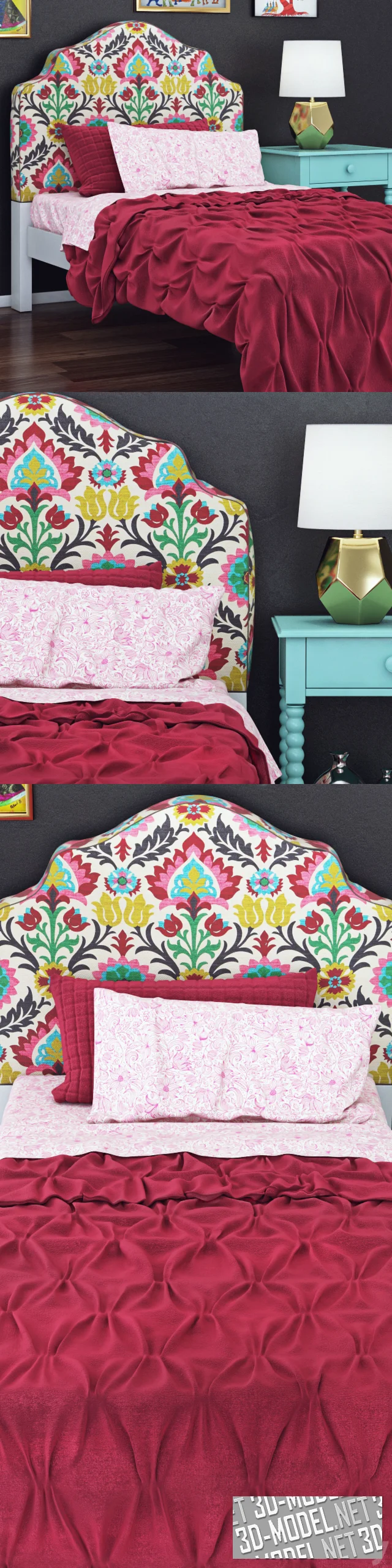 Современная односпальная кровать The Land of Nod. Выполнена в этно-стиле. Особый колорит придает изголовье (Twin Arched Upholstered Headboard) с узором «Цветок пустыни». Размер кровати: 104 х 210 см.
