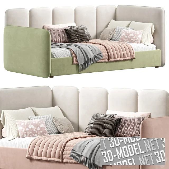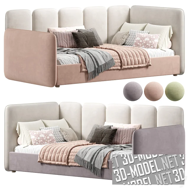 Кровать представлена в нескольких нежных пастельных тонах – сиреневом, нежно-розовом и светло-шалфейном, с кремовым изголовьем, – поэтому она одинаково хорошо впишется в детскую, спальню подростка или стильную игровую комнату. Многослойный текстиль, стеганое одеяло и декоративные подушки добавляют объем и тепло, делая кровать привлекательной как для ночного сна, так и для дневного отдыха, чтения или просмотра мультфильмов.