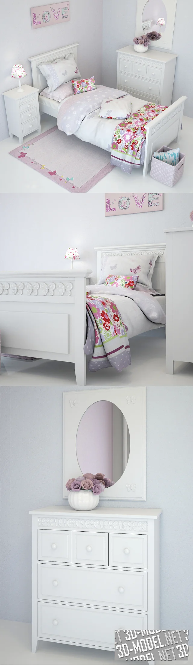 Милый набор белой мебели и аксессуаров в девичью спальню - модель Florence Flutterby от Little Lucy Willow. В комплекте белые с орнаментами из резных бабочек и филенками на фасадах и плоскостях: односпальная кровать, комод с двумя широкими и тремя маленькими ящиками, высокая тумба с тремя ящиками, прямоугольная вертикальная рама с овальным настенным зеркалом.