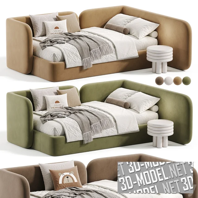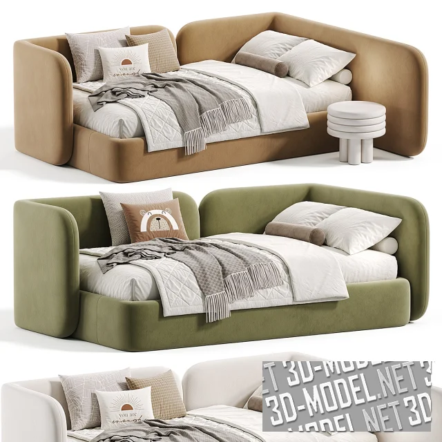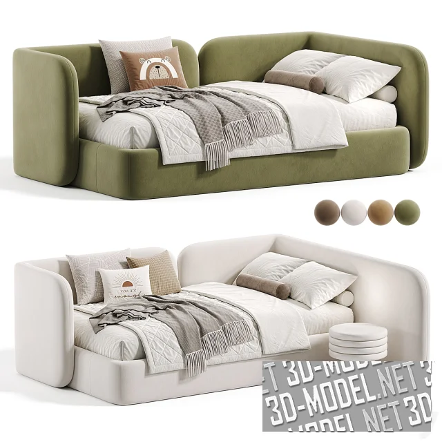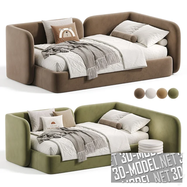 Уютная детская кровать с мягкой боковой спинкой и изголовьем - Amalia 90 от divan.ru. На белом постельном белье лежит небольшой серый плед с бахромой. К спинке прислонены декоративные подушки с забавным рисунком. В сцене представлены четыре варианта цвета велюровой обивки. Размеры кровати: длина 228 см, ширина 110 см, высота 81 см. Спальное место: длина 200 см, ширина 90 см, высота 38 см.