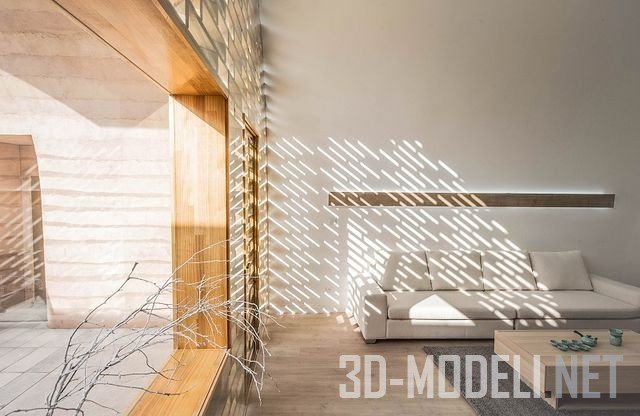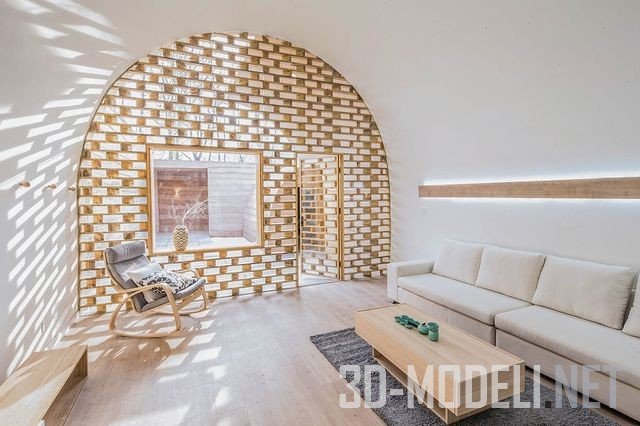 ванная комната, столовая и место для хранения. Чтобы обеспечить связь между интерьером и экстерьером, использование натуральных материалов продолжается и внутри: это деревянные стены и мебель. Встроенные световые люки позволяют проникать в дом большему количеству света. Центральный люк создает легкий тоннель из стекла, отделяющий спальню и жилую площадь главного дома. Вход в дом представляет собой полуизогнутый