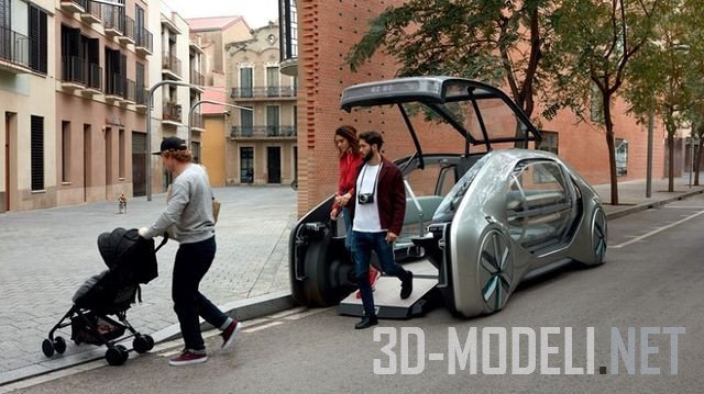 концепт автомобиля Renault EZ-GO обладает гладким и почти полностью прозрачным, футуристичным дизайном. EZ-GO скорее сродни