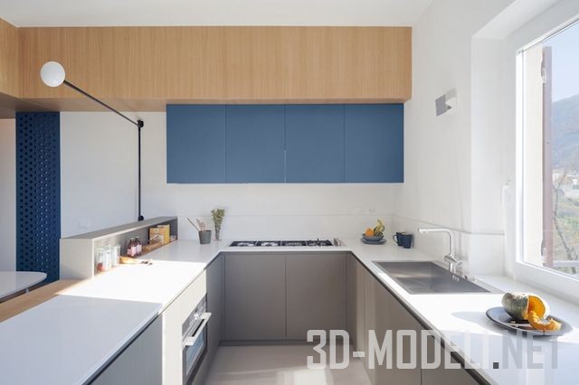 На кухне и в коридоре части этого креста соединяются с синими поверхностями, которые тянутся вдоль вертикальных плоскостей