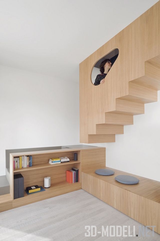 подвесную лестницу, которая висит в воздухе, а второй продолжает путь вниз до первого этажа. Результат - изворотливый и игривый, с проемом, который позволяет жителям заглядывать в комнату во время движения вверх и вниз по лестнице. Дополняющая структура на полу выполняет четыре функции: это