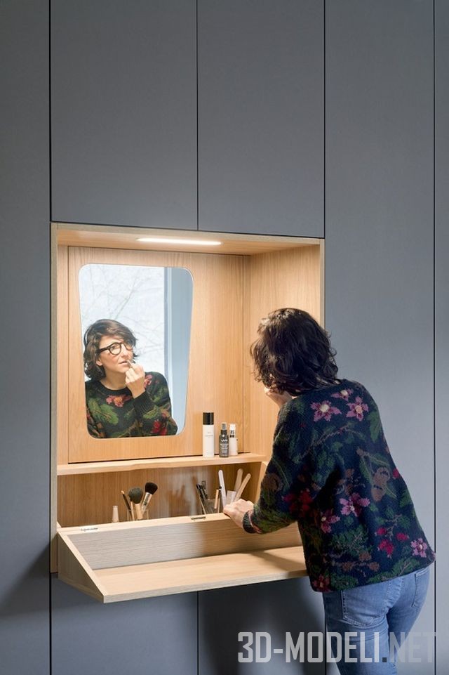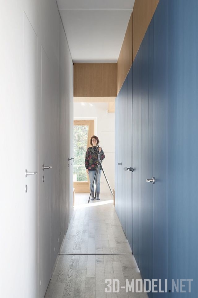 в виде шкафов. Двери в ванных комнатах и в спальнях также устанавливаются в этих объемах. В конце коридора находится вход в спальню хозяев, в которой предусмотрена зеркальная стена, чтобы визуально удвоить размер пространства.