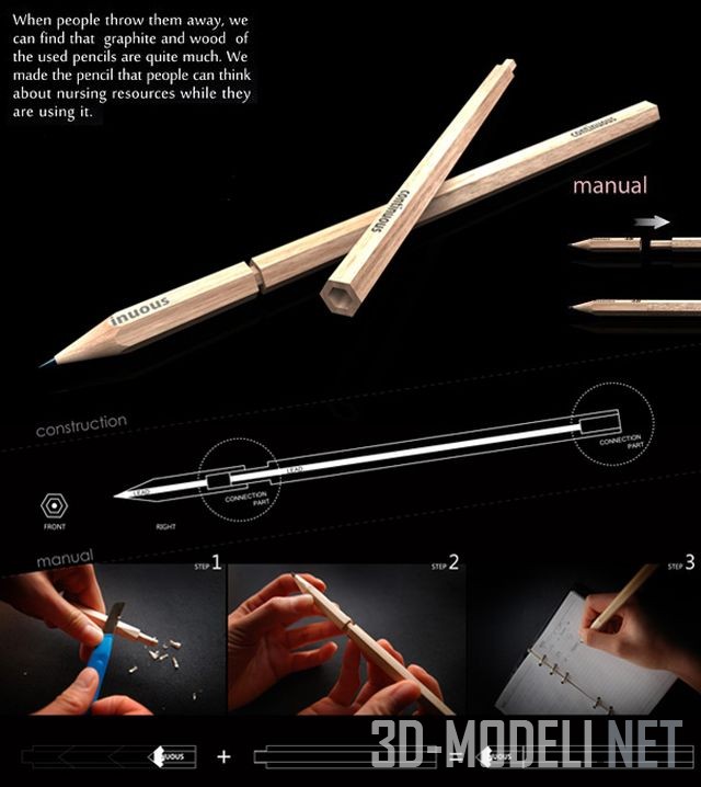 карандаш неудобно держать. Но эта концепция дизайнеров U Jung Heo, Young Gag Han и Sa Yoeng Kim позволяет продолжать увеличивать длину с помощью удобной палки, которая плотно прилегает к задней панели. Continuous Pencil – никогда не кончается!